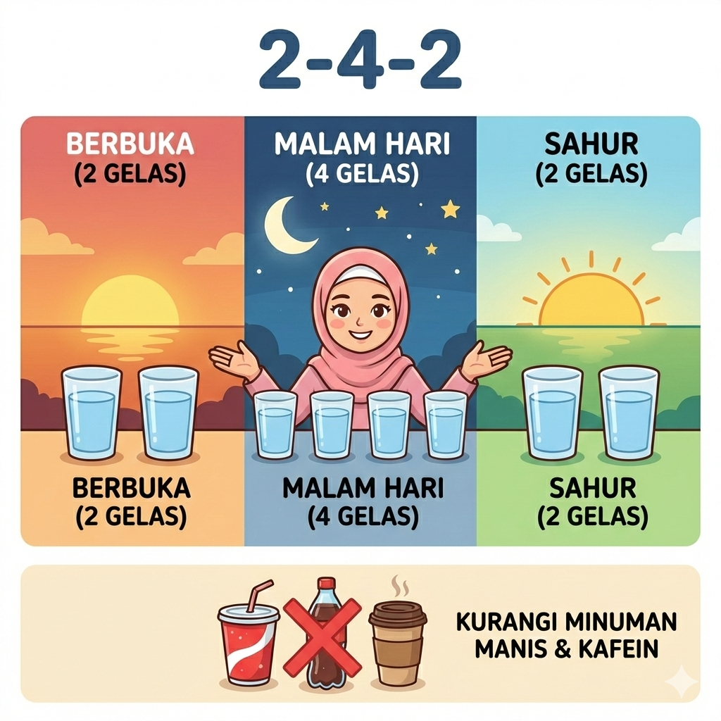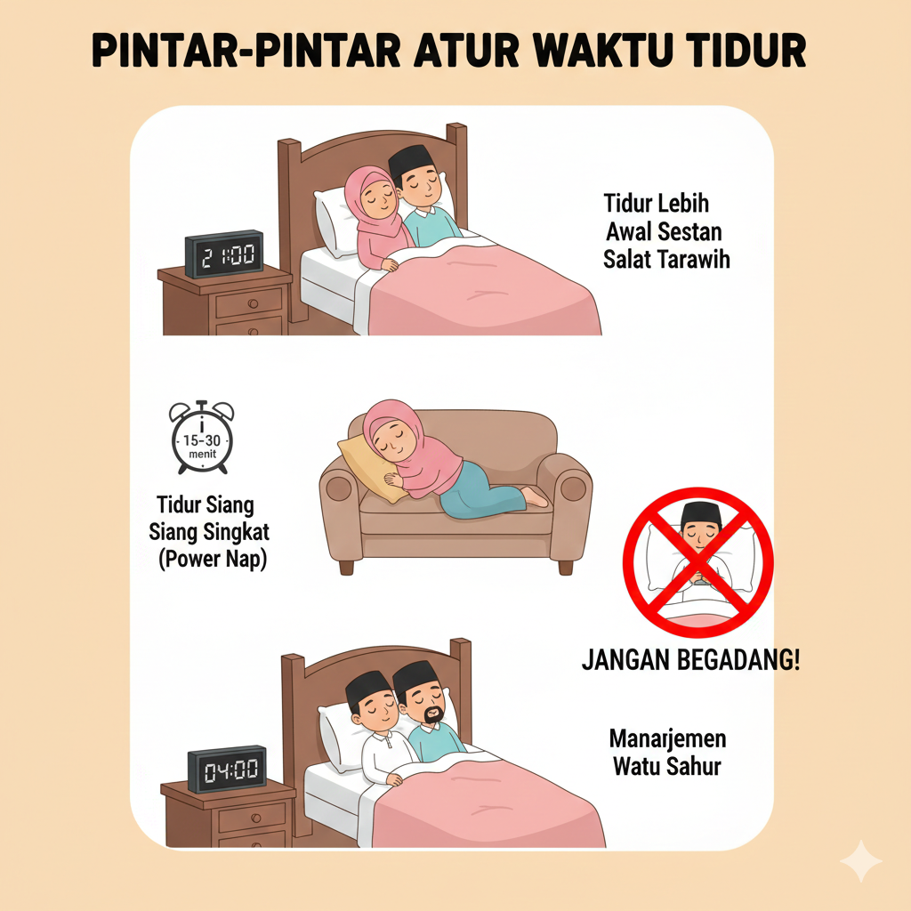 Bangun sahur otomatis bikin jam tidur berkurang. Solusinya, kamu perlu manajemen waktu yang baik agar istirahat tetap cukup. Usahakan tidur lebih awal setelah salat tarawih. Kalau sempat, tidur siang singkat (power nap) selama 15-30 menit juga efektif buat balikin energi.