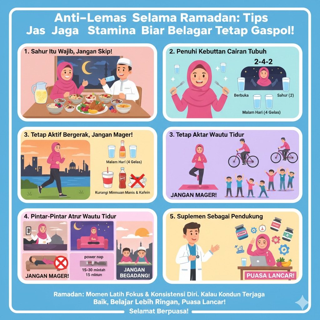 Menjalani puasa sambil tetap aktif belajar memang butuh usaha ekstra, tapi justru di situlah tantangannya. Jadikan Ramadan ini momen buat melatih fokus dan konsistensi diri. Kalau kondisi tubuh terjaga dengan baik, belajar jadi lebih ringan dan ibadah puasa pun makin lancar. Selamat menjalankan ibadah puasa, semoga semangat sampai akhir!